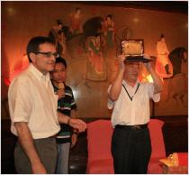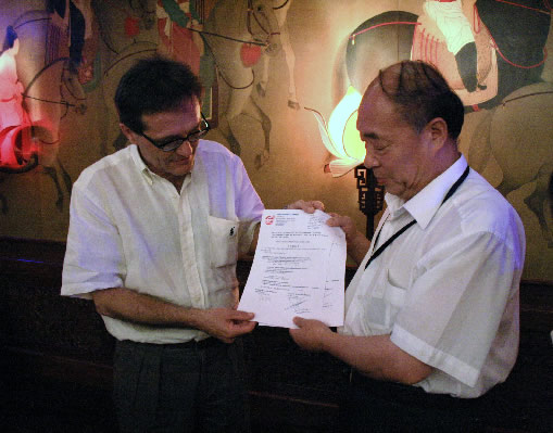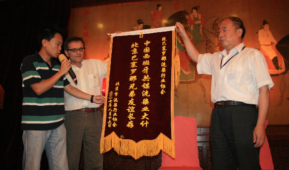En el transcurso del viaje, la delegación del Gremi, acompañada por los miembros de la asociación de Pekín y por personal de SERVISECO, tuvieron la oportunidad de visitar diversos establecimientos de tintorería y pulsar el notable y pujante desarrollo del sector en china. Ya en la cena del 30 Aniversario que clausuraba el viaje, el Presidente del Gremi Sr. Puertolas, tuvo la oportunidad de dirigirse a los presentes, en un discurso en el que resaltó el clima de colaboración y cordialidad establecido entre ambas asociaciones y los deseos trabajar conjuntamente para compartir experiencias futuras que afiancen los lazos de amistad emprendidos. En este sentido, el President Del Gremi hizo entrega al Presidente de la Asociación de Pekín Sr. Wang Xue Ren, de una placa conmemorativa del encuentro, hecho que fue correspondido por la Asociación de China con la entrega al Gremi de un banderín grabado con las consignas de amistad y cooperación entre ambos colectivos. Posteriormente en una reunión en “petit comité” la delegación del Gremi trasladó a sus homólogos de Pekín los logros conseguidos por el Gremi en materia de formación y desarrollo del Plan de Dinamización Sectorial, e hizo entrega de diversos ejemplares destacados de la revista Tinto-Limp, así como de diversa documentación de los servicios que el Gremi presta a sus asociados. Concluida la reunión y en presencia de todos los asistentes a la cena, se procedió al solemne acto de la firma del protocolo de colaboración por parte de los presidentes de ambas asociaciones, acto que fue seguido por la entrega por parte del Vicepresidente del Gremi Sr. Muntané, de una exclusiva corbata del GTiB al Sr. Román Prado en reconocimiento de los 30 años de trayectoria en el sector de la firma SERVISECO. Para concluir los miembros de ambas asociaciones junto al Sr. Román Prado, posaron para la instantánea que inmortalizaba el acto.