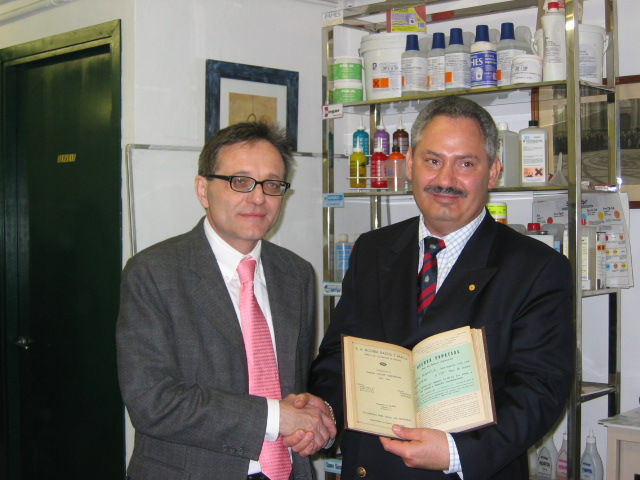 Acto seguido, el Sr. Locorotondo ofreció a nuestra entidad una placa conmemorativa del acto, y el Sr. Pennino Giuseppe Director de “Sotto la Lente” revista de técnica de tintorería de la asociación italiana, entregó a nuestro presidente una encuadernación de las ediciones de los últimos años. Asimismo y por gentileza del Ajuntament de Barcelona, se hizo entrega a cada uno de los miembros de la expedición italiana de un ejemplar en italiano del libro de La Ciudad de Barcelona.
