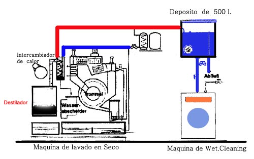 Una máquina de limpieza húmeda admite la combinación ideal con otra de disolvente, ya que así se puede utilizar el agua de refrigeración para el tratamiento húmedo. Si se consume agua nueva, según la Ley de uso racional del agua (WHG), al agua de refrigeración de una lavadora debe darse un segundo aprovechamiento y no debe dejarse fluir al desagüe como todavía sucede con frecuencia. Esta agua de refrigeración se recoge en un depósito colector y desde él se alimenta a la lavadora. De este modo se cumple la Ley de uso racional del agua (WHG) y se ahorran considerables cantidades de agua (aprox. 20 litros por kilo de ropa) y también de energía. El agua de refrigeración tiene por término medio una temperatura de aprox. 30 - 38° C. Las aplicaciones prácticas han demostrado que esta agua puede utilizarse de manera ideal para la limpieza húmeda de la ropa exterior. Si se ajustan óptimamente la lavadora de textiles y la lavadora húmeda, se podrá prescindir en gran medida de una toma de agua nueva.