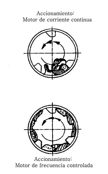 El motor tradicional recibe el impulso para lavar, distribuir o centrifugar y atiende estas tareas con el máximo consumo posible de corriente eléctrica. De este modo se produce un consumo superior de energía eléctrica y una carga excesivamente alta para el motor. Mediante el arranque rápido del tambor en la fase de centrifugación, el material lavado tiende a desplazarse puntualmente por delante de un nervio de arrastre, con 10 cual se produce un alto nivel de ruido durante el funcionamiento. Esto es lo que sucede sobre todo en caso de carga inferior a 10 normal.