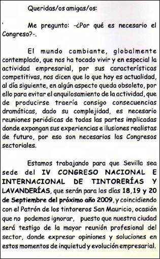 Casi como de sorpresa nos hemos enterado que la Asociación de Tintorerias y Lavanderías de Sevilla, está preparando un nuevo congreso. Y decimos de sorpresa, porque justo a pasado un año desde el congreso de Mallorca y en nuestro sector esta frecuencia no es nada habitual, tal como reflejan los seis años transcurridos desde al anterior celebrado en Oviedo. A priori un congreso siempre representa un evento positivo para un sector que adolece de una precaria comunicación entre profesionales, pero al mismo tiempo hemos de esperar de la organización una preparación minuciosa y exaustiva, que dote de contenidos interesantes y de actualidad que puedan ser útiles al colectivo. desde estas páginas intentaremos aportar nuestro granito de arena y ofrecer nuestra visión de las problematicas que el sector deberia abordar en un congreso. En las fotos adjuntas, os ofrecemos la carta de presentación del congreso redactada por la presidenta de la asociación Sra. Marta Gonzalez. Clicando en las fotos podreis ampliarlas para leer detenidamente el texto. Esperamos recibir más noticias de la evolución de su preparación, así como ofrecemos este espació a la Organización para que pueda divulgar las efemerides que estime oportunas. |