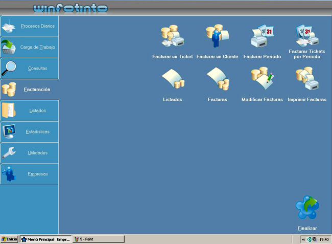 Infotinto es la versión en MS-DOS, seguramente la aplicación más estable y robusta del mercado aunque últimamente Winfotinto está ganando terreno ya que reúne las mismas funcionalidades que Infotinto y además incorpora nuevas características como pantalla táctil, cinta transportadora, e-mail, SMS, etc. Permite un entorno de trabajo más intuitivo y mejor adaptado a las necesidades actuales de nuestros negocios.